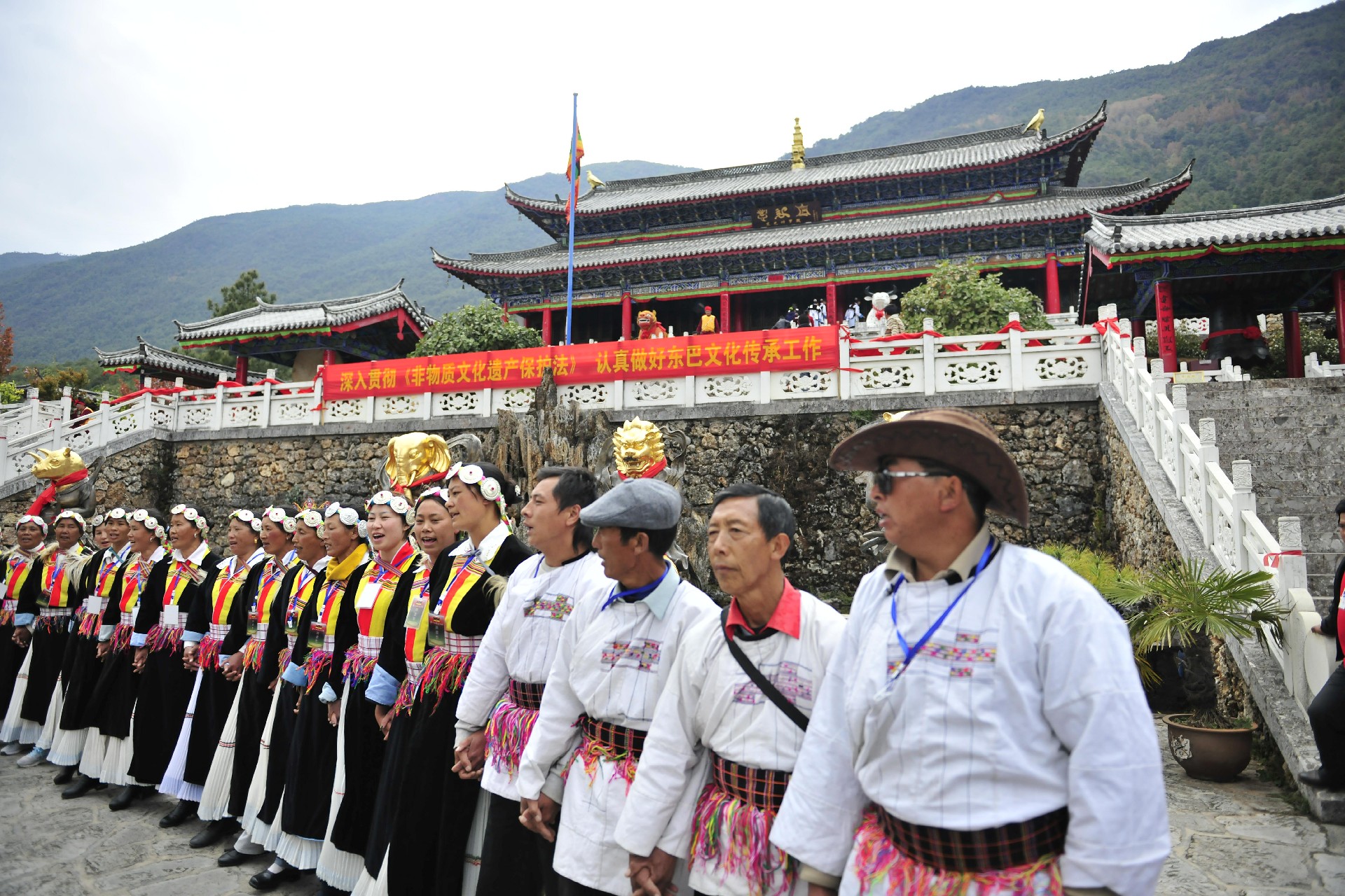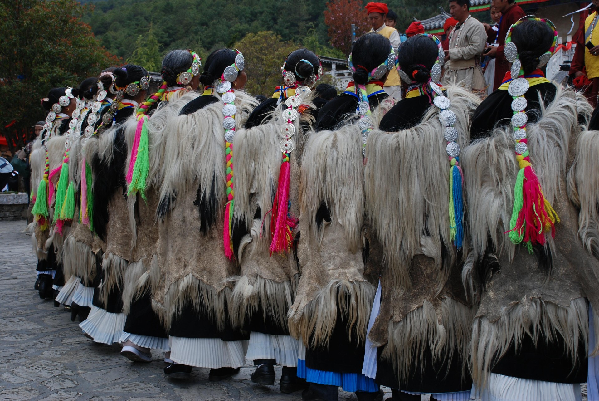 迪庆藏族自治州香格里拉市三坝纳西族乡的妇女留长发,束于脑后或编成长辫,发辫上饰有花纹的圆形银牌。身穿开长杈的搭襟白色麻布长衣,襟边黑色加彩绣,腰系黑底七彩色线格花并垂飘穗的腰带。穿长裤围彩色条纹百褶裙,穿毡鞋或靴,背披白毛山羊皮,戴耳环、手镯,其服饰色调素雅,古朴大方。男子穿白色麻布搭襟长衫,领子和袖口镶红布边,穿长裤,扎红腰带。
