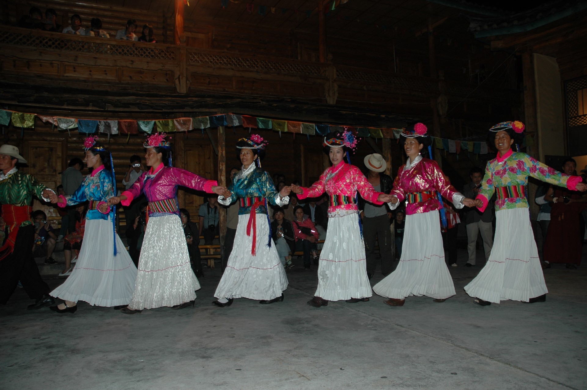 摩梭成年女子穿镶彩色花边色彩亮丽(多为红、黄、蓝、紫)的短上衣,领口袖口有彩色滚边,下身着蓝白衬里的双层百褶长裙,系五彩厚腰带,脚穿青布绣花鞋。留长发,掺以乌黑油亮的牦牛尾编成粗大的发辫盘于头顶,上缠一圈蓝黑绒线,并将绒线后垂至腰部。头饰挂珍珠串坠和各色鲜艳的花饰品。