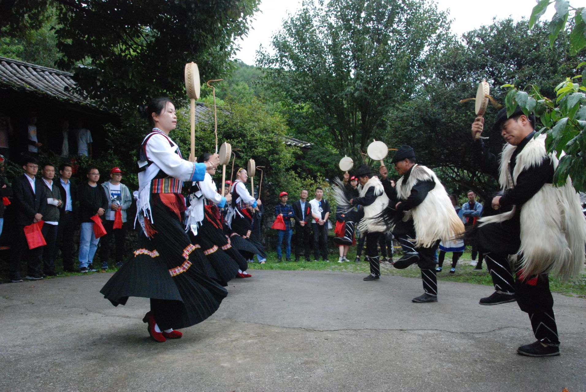勒巴舞勒巴舞是纳西族的一种传统舞蹈,这套乐舞流传于滇西北金沙江沿边塔城等地,由于地处偏僻,交通封闭,这套乐舞比较完整的保留了下来。从纳西族诗人李玉湛《(1827—1887年)的《黎巴舞》“左擎牦尾右摇鼗,燕接凫连柳絮飘”。一诗可以得知,勒巴舞在19世纪中叶已在金沙江沿岸的纳西族中广为流传。解放后,由于历史的原因,勒巴舞被中断了30年,直到改革开放以后,勒巴舞才逐渐恢复起来。现在随着社会经济的发展,各种庆典活动都少不了传统的勒巴舞。因为舞蹈动作庄重而大方,粗狂豪放,富有浓郁的纳西族气息,舞蹈中体现出纳西族活泼开朗乐观的性格,并以优美动听的歌词穿插其中,为歌颂美好生活,希望人寿年丰,风调雨顺,万事如意。是欢庆丰收,表达美好生活的古老民间舞蹈,具有象征吉祥平安的功用。勒巴舞具有早期原始艺术“三位一体”的形态特征。勒巴舞共有十二节,每节5—9种跳法。舞蹈类型:主要是仿动物舞、劳作舞、祭祀舞等。并配有唱词诵词40多段,有祭奉诸神仪式,为了体现这种舞蹈的严肃性,必须按12节的前后顺序进行,按照程序需要8个小时左右,常常要跳到天亮或日出。勒巴舞道具方面,有一个大鼓伴奏,男右手持板鼓,左手甩牦尾,女士左手持长棒女鼓,右手持鼓棒。勒巴舞服饰方面,男士白衣长衫、短褂、羊毛线裙,戴头帕或帽子,身挂红带;女士白兰灰色内衣,红褂子,花边黑裙或白裙,身后挂红色带子,红色头帕佩带银耳环。勒巴舞的保护和发展,关键在于传承,在以前,勒巴舞的传承均以家族式传承,普遍以父传子,叔传侄的方式在传承,为了把这一纳西族宝贵的民族文化更好的传承下来,玉水寨公司于2001年聘请勒巴舞第六代传人李文先到玉水寨担任勒巴舞老师,开始招收一批年轻人教授勒巴舞,通过多年的传承保护,玉水寨为拉市乡、白沙乡、古城先后培养了300多人,勒巴舞得以在丽江普及。